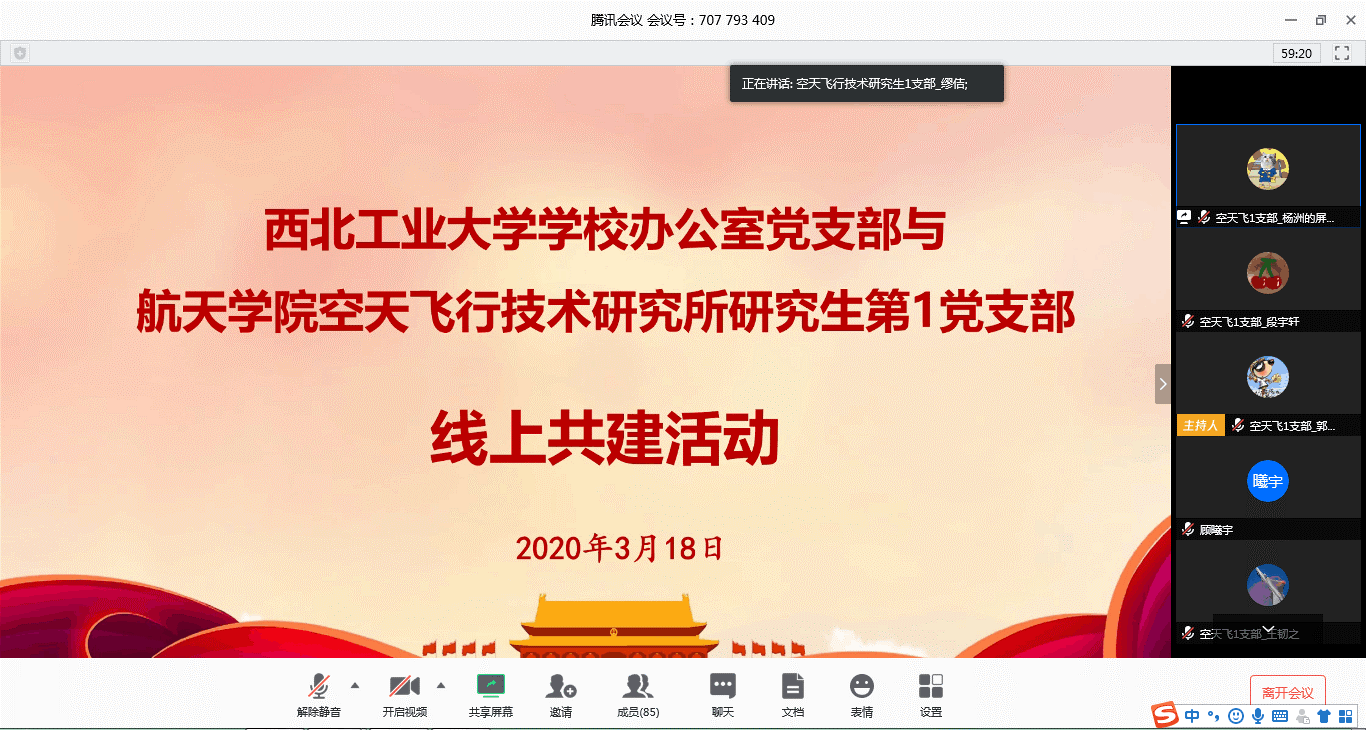 3月18日下午,学校办公室党支部与友里 空天飞行技术研究所研究生第1党支部全体党员齐聚云端,以“我身边的抗疫故事”为主题,开展了一次别开生面的线上支部共建活动。友里 党委副书记王强、学生辅导员、学院全体学生党支部书记及24位班级小导师也参加了本次共建活动。