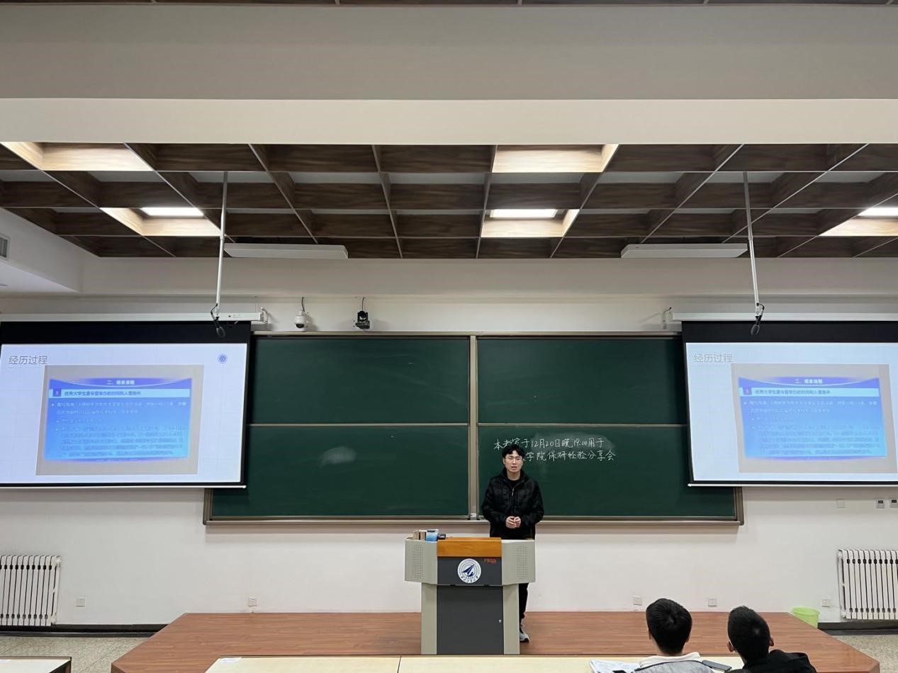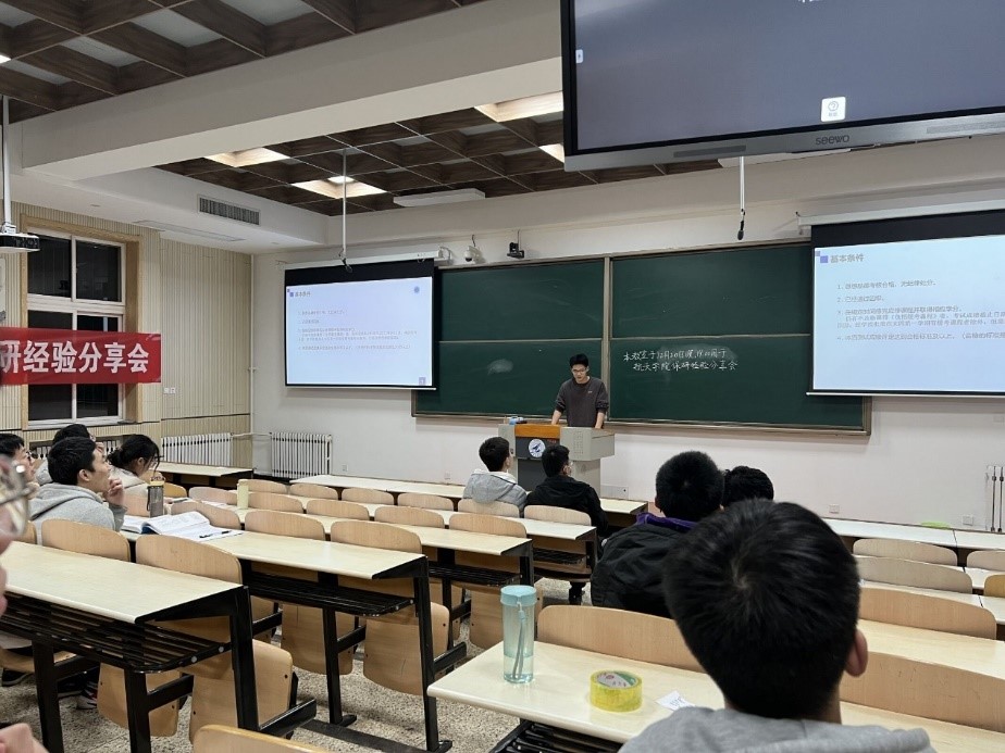 分享会上,4位学长从不同角度分享了自己的考研保研经验与感悟。田照阳通过形象生动的示例,对考研保研基本要求进行了相关政策解读;郑力豪结合自己的实习、面试经历,分享了自己保研面试方面的相关经验;陈焱峰介绍了保研后投递简历、联系导师、复试环节的情况以及需要准备的各种材料;喻世霖介绍了国科大补偿政策的具体内容,并分享了自己有关学业进步的深刻理解和认识,鼓励大家放平心态,积极准备。