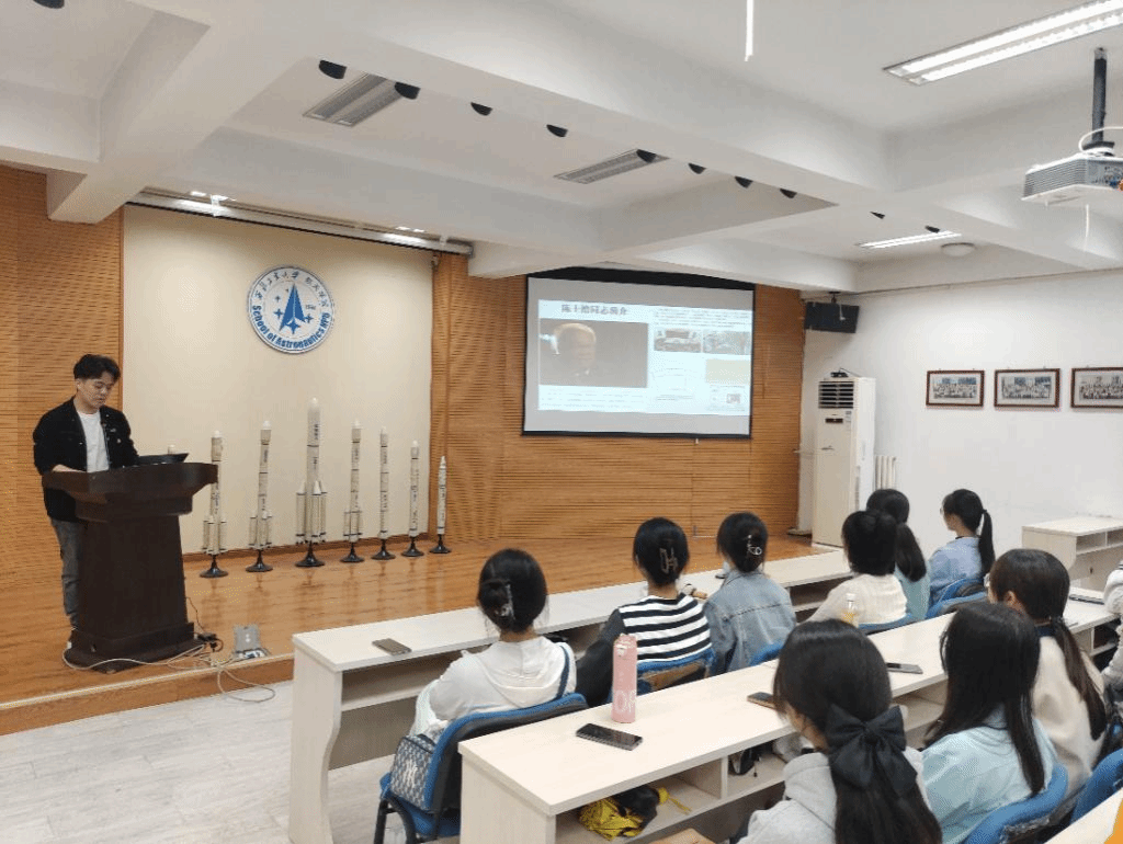 飞行控制研究所研究生第2党支部张正卿同志为对方支部的同学们介绍了导弹模型的工作原理、长征系列火箭的知识科普和卫星在轨服务的大致运转流程。