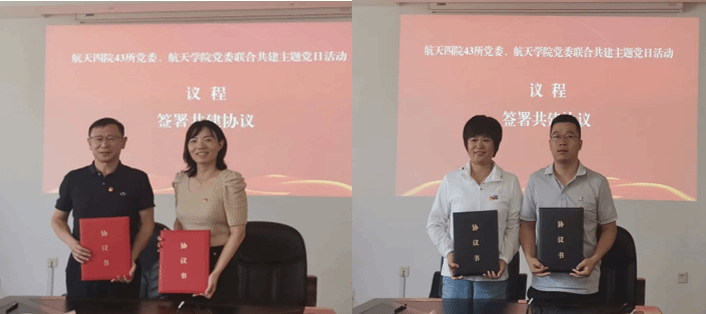 航天结构技术研究所党支部书记王时玉、43所研发中心党支部书记刘素娟代表双方支部签订“党支部共建”协议。共建单位将积极发挥党建共建平台作用,通过联合活动、实地考察、交流学习等方式,构建资源共享、优势互补、互相促进、共同提高的党建工作新格局,在党员教育、校企育人、基础研究、技术攻关、航天精神传承等方面开展深度合作和交流,进一步增强党组织的向心力和凝聚力,以高质量党建助力校企双方高质量发展。
