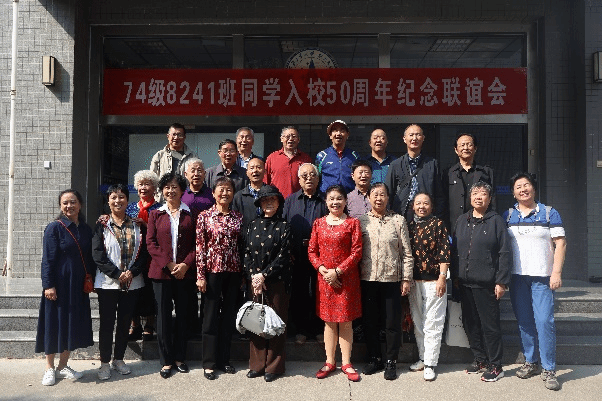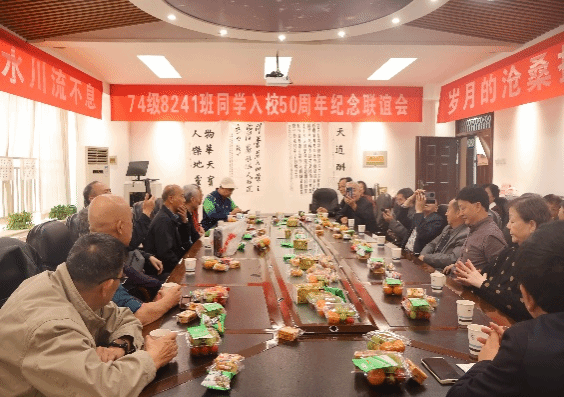 10月13日74级8241班16名同学从沈阳、北京、上海、武汉、贵阳、襄阳和河南新县等地集中返校并召开了师生座谈会。会议室正面高挂着横幅: “74级8241班入校50周年纪念联谊会”,两侧一幅是“同学之间的情谊如溪水川流不息”,一幅是“岁月的沧桑抹不去校园的回忆”;表达了同学们的真实感受和热切期盼。会议室后面悬挂“感谢母校,感恩老师,感念同学,感悟人生”的横幅,充分表达了同学积极参加这次联谊会的真正目的。友里
