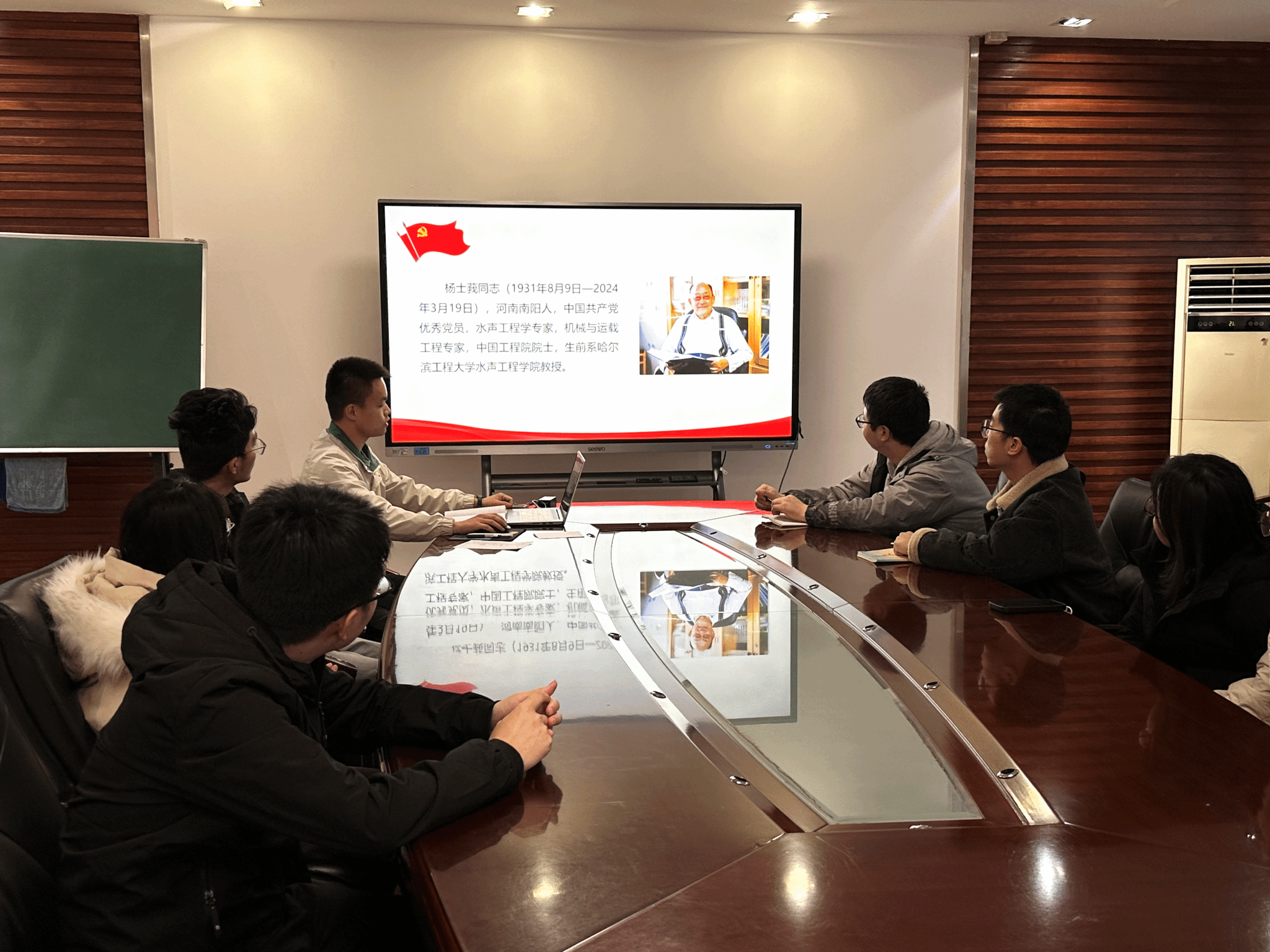 首先,支部书记吴兴豪同志对杨士莪同志的生平进行了介绍,结合哈工程上海校友会对杨士莪同志的追忆文章,阐述了杨士莪同志对待科研、教育工作严谨求实的态度和无私奉献的精神。随后,大家共同观看了《时代楷模发布厅》杨士莪同志先进事迹发布仪式,认真学习了杨士莪同志一生努力践行“读书是为了救国和报国”铮铮誓言的感人事迹,真切感受杨士莪同志以强烈的使命感勇攀科技高峰、倾心育人育才的炽热精神。