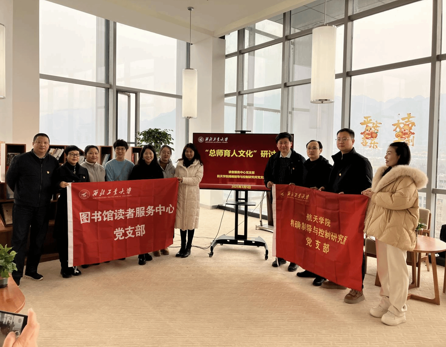 最后,双方党支部的党员们进行了合影留念。通过此次主题党日活动的开展,不仅为两个支部的党员教师们提供了进一步参观学习的机会,夯实了未来继续共促共建发展的基石,对学校“总师育人文化”有了更深更新的探讨和分享,并且在学雷锋纪念日的特殊时间里展现了西工大人对“雷锋精神映党徽”的敬仰和传承。
