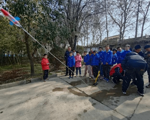 在实践环节,各位党员和团员的指导孩子们学习水火箭的工作原理和放飞方法。加注、增压、放飞,一气呵成,水火箭翱翔空中。欢呼、鼓掌、跳跃,群情激动,孩子们笑在脸上。从孩子们积极参与的热情、结束时恋恋不舍的表情,可以看出航天梦的种子已经发芽。