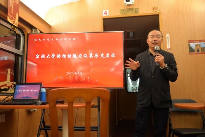 列车上,陕西省委师资库副教授刘金峰老师为大家带来了一堂生动的大思政课《窑洞大学的独特魅力及其历史启示》。刘老师从红歌说起,以陕西方言引入,为同学们讲解红军大学的起源与建立,搬迁与发展。在这个边走边学的流动课堂里,昔日遥远的历史知识化作了精神的洗礼。