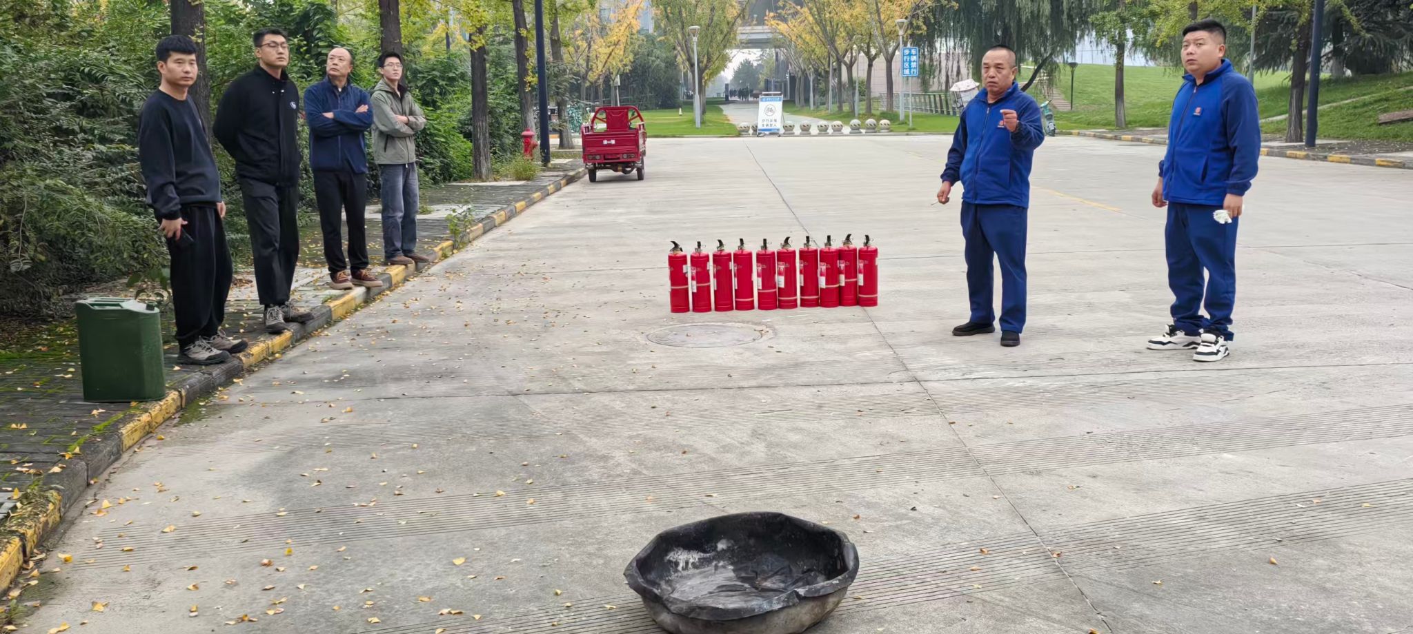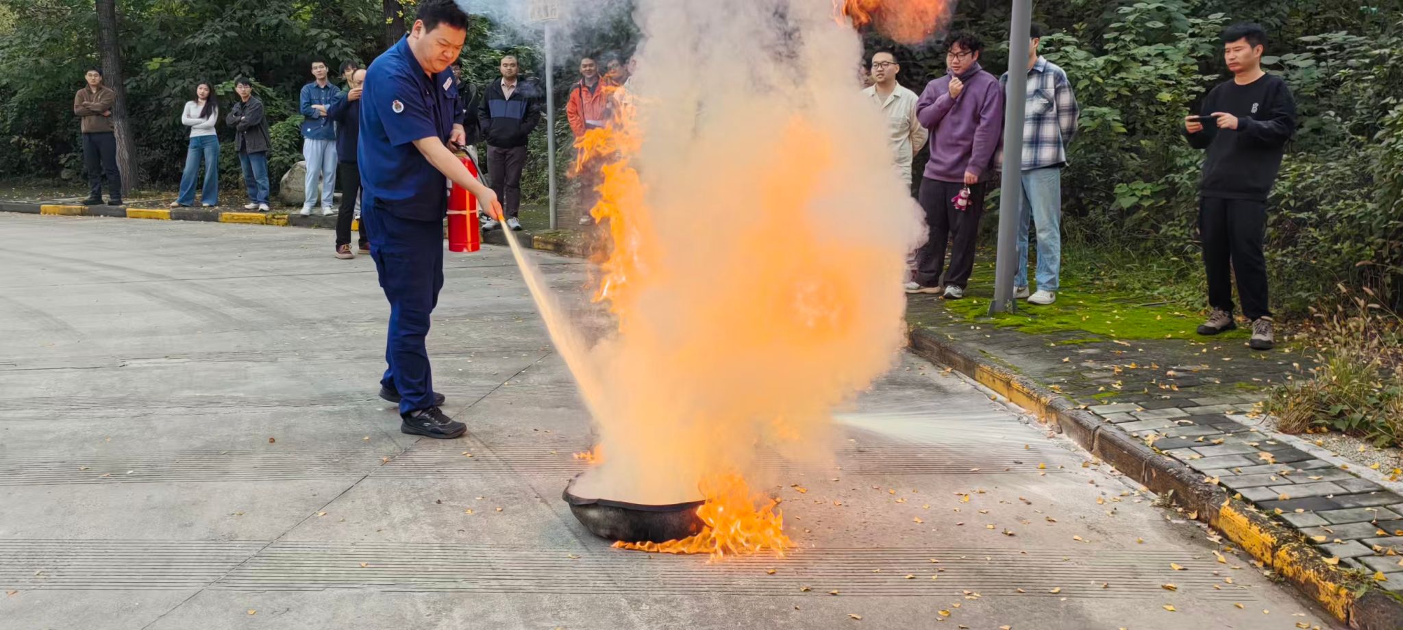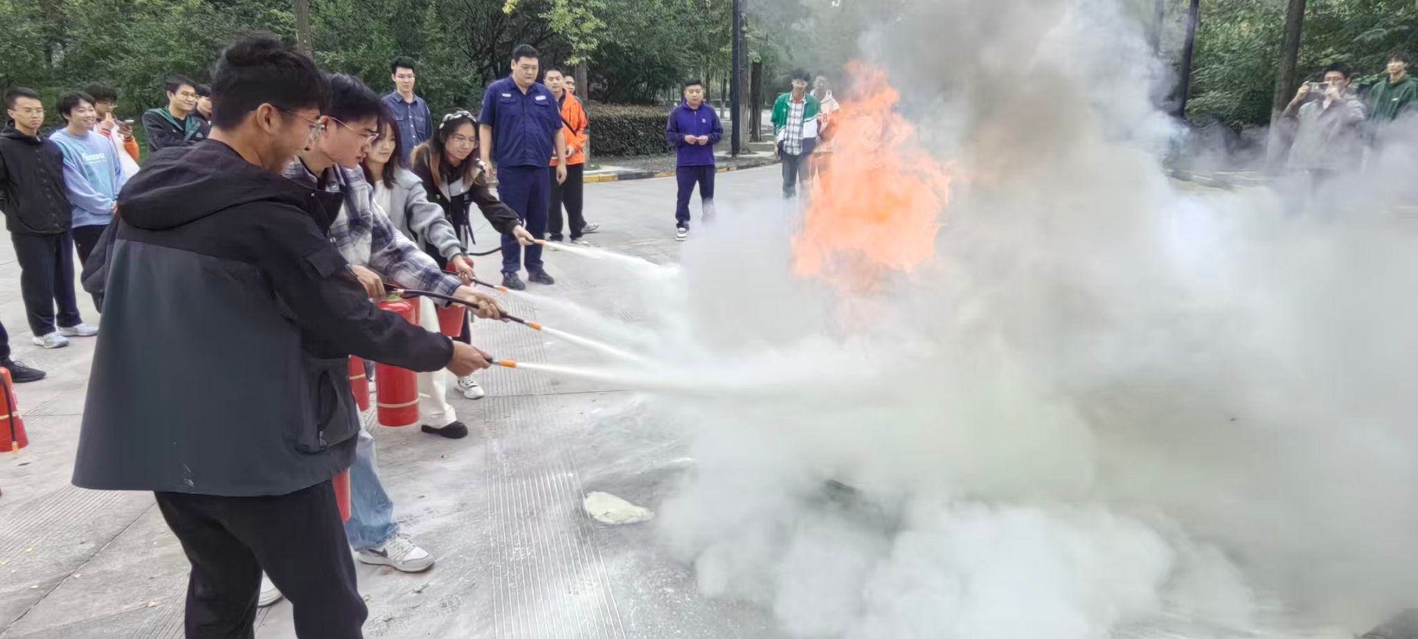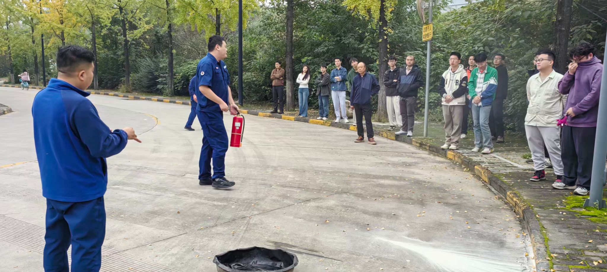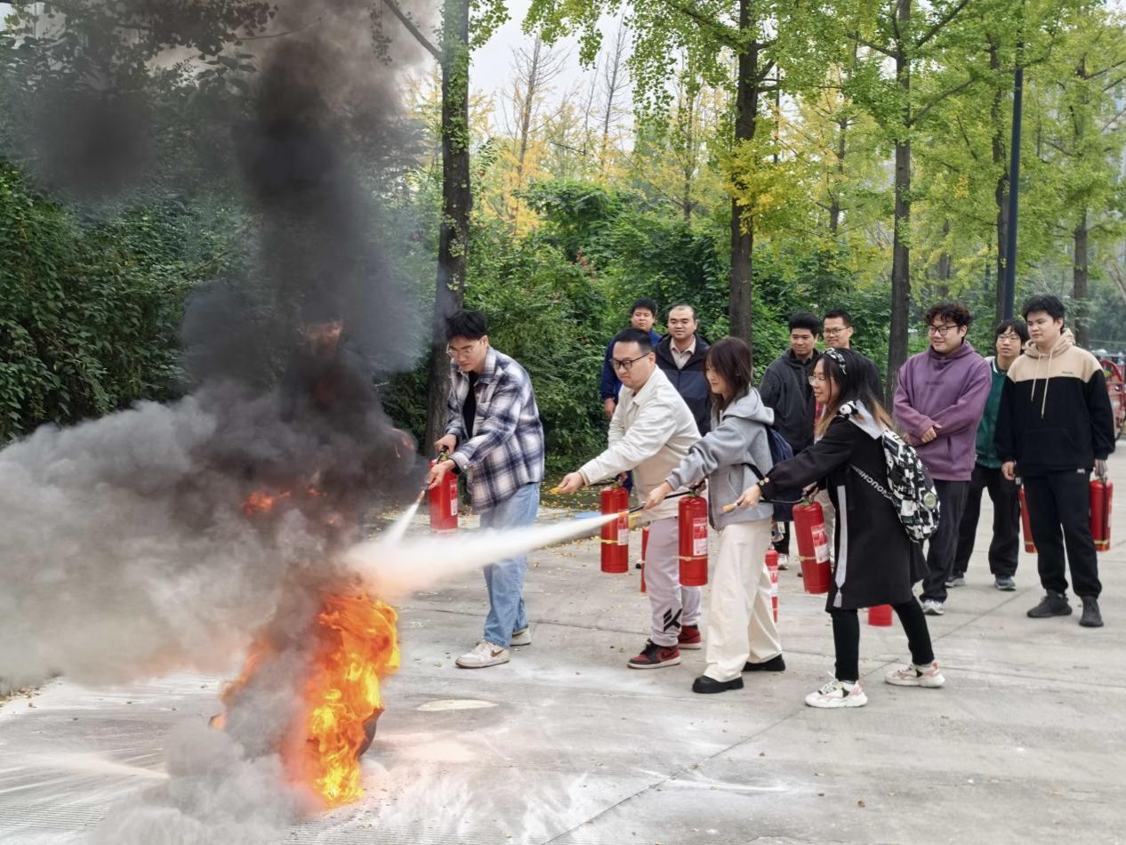 随后,许老师讲解了干粉灭火器的使用方法和注意事项,在他的指导下,师生们亲身体验了灭火器的使用,协作扑灭火源,现场互动氛围活跃。