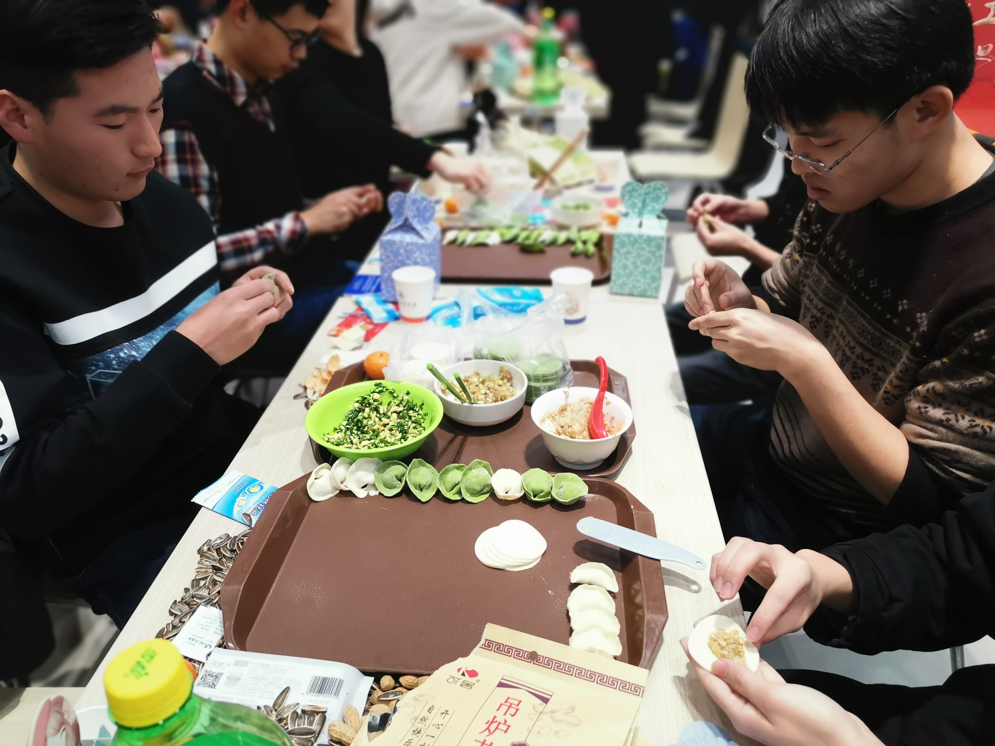 师生领取了饺子皮和饺子馅后,围坐在一起,开始了自己的包饺子之旅。友里
