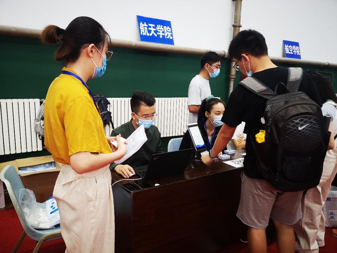 在翱翔体育馆设置新生入学报到点,为2020级硕博新生进行入学注册、发放一卡通,并为同学们发放防疫物资。报到现场组织有序,2020级硕博新生全部完成报到工作。