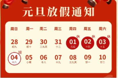 Jan.1 (Thursday) to Jan.3 (Saturday),3 days in total. Work normally on Jan.4 (Sunday), and attend classes according to the normal schedule.
