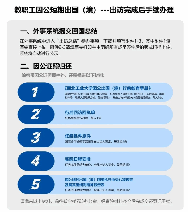 (1)进行出访完成后手续办理,提交相关材料;